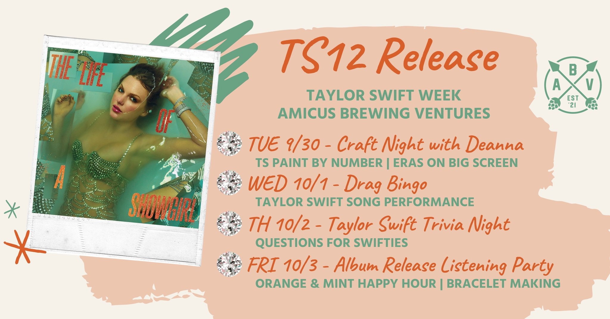 Tuesday, Sept. 30 Tuesday, Sept. 30 to Friday, Oct. 3 Featured Event: Taylor Swift 12 Release Week by Amicus Brewing Ventures | Tuesday, Sept. 30 to Friday, Oct. 3 | 4 PM | Amicus Brewing Ventures, 717 S. Gadsden St. | Learn More