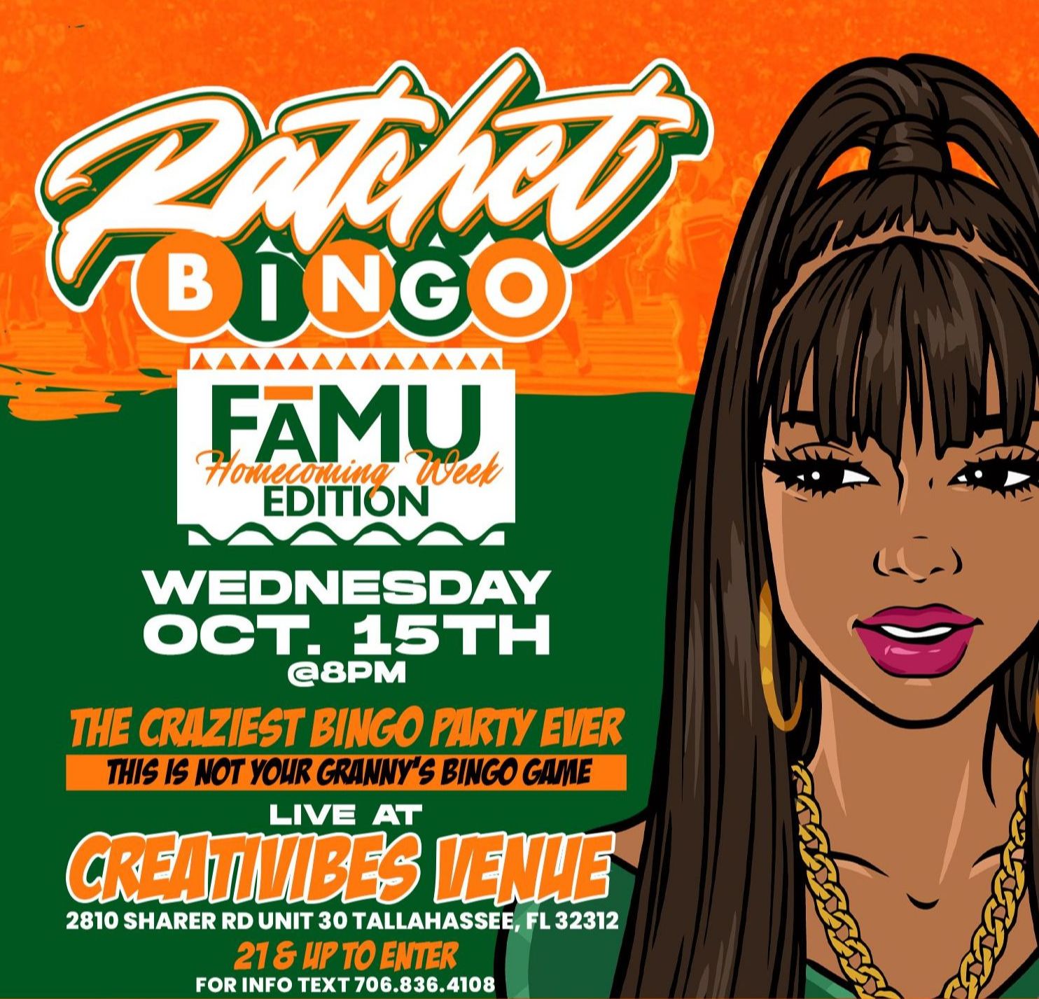 | | Saturday to Sunday, Oct. 11 to 12 Sunday, Oct. 12 Wednesday, Oct. 15 Fall Concert by TSC Jazz Band | Wednesday, Oct. 15 | 7:30 PM | Turner Auditorium, 444 Appleyard Dr. | Free Learn More Featured Event: FAMU Homecoming Week Edition by Ratchet Bingo | Wednesday, Oct. 15 | 8 PM | Creativibes Venue, 2810 Sharer Road #Unit 30 | From $45 Tickets | Learn More
